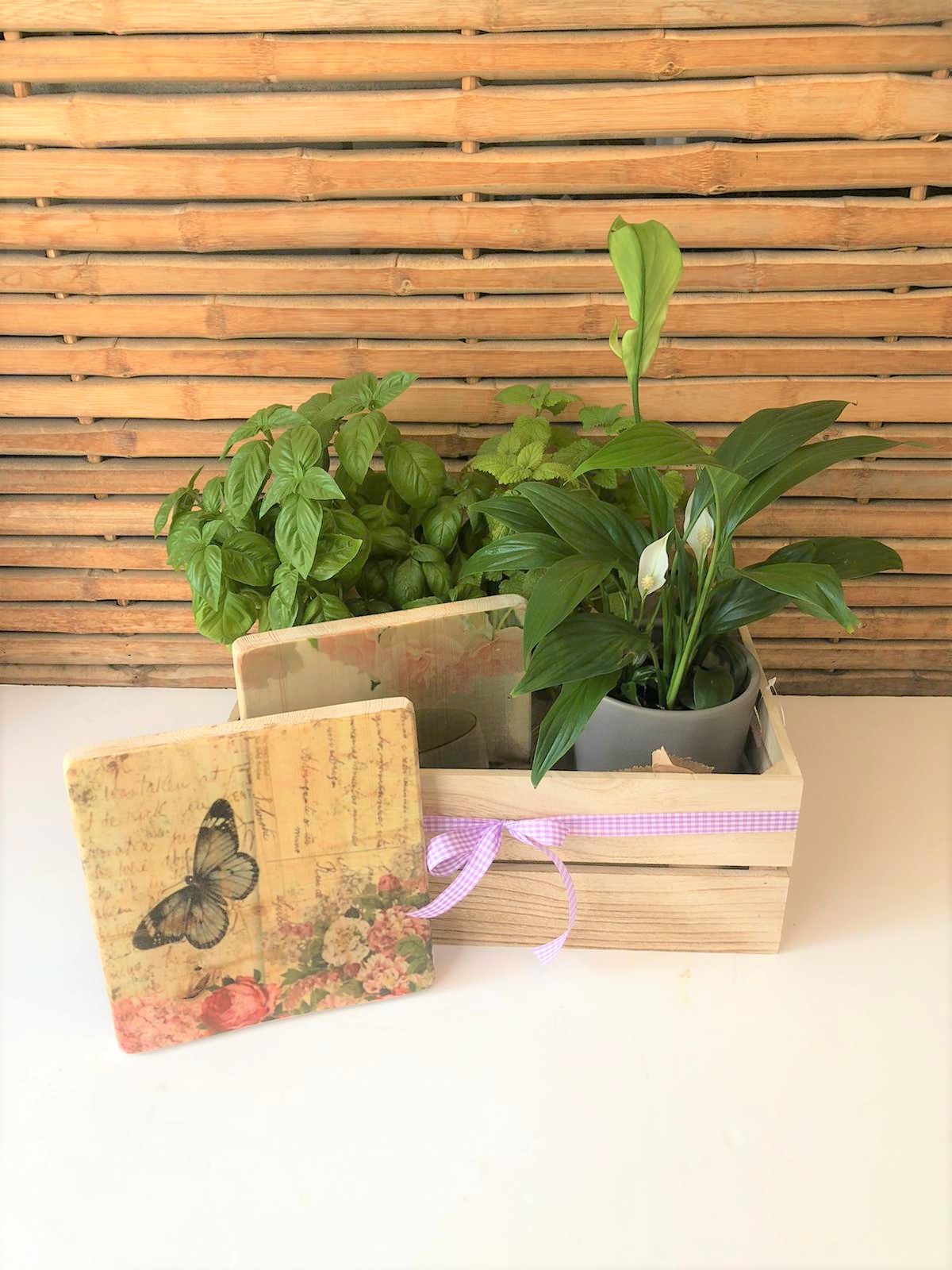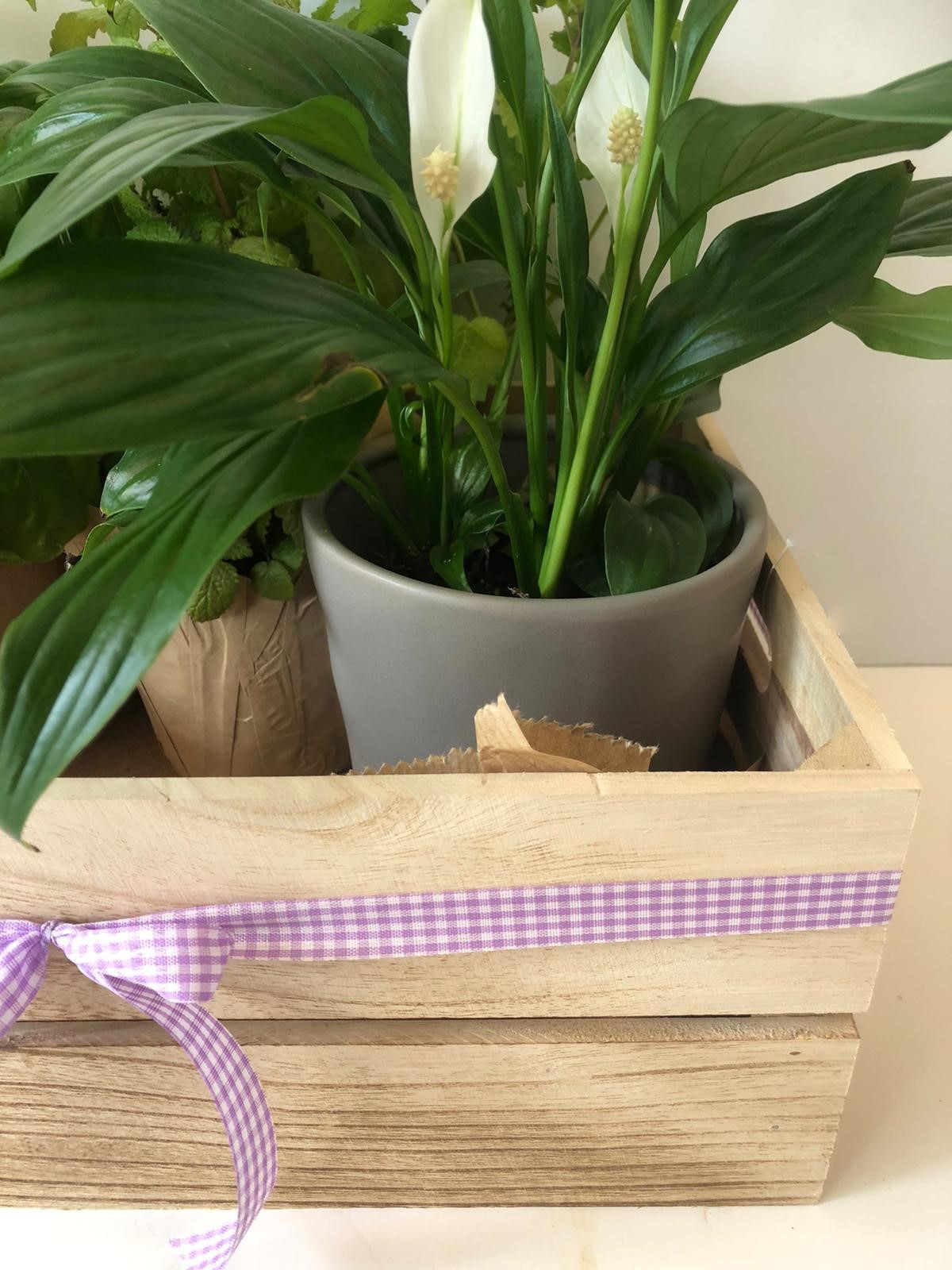 מארז אוירה לבית ירוק, 2 צמחי תבלין בהתאם למלאי ולעונות השנה, עציץ ספטיפיליום פורח בלבן בכלי קרמיקה, 2 תמונות אוירה בעבודת יד על עץ לתליה או הנחה על מדף, (התמונות להמחשה, אספקה לפי המלאי בחנות) כל השמחה ארוזה בארגז עץ לאכסון ירקות/פרות ואפילו צעצועים.
